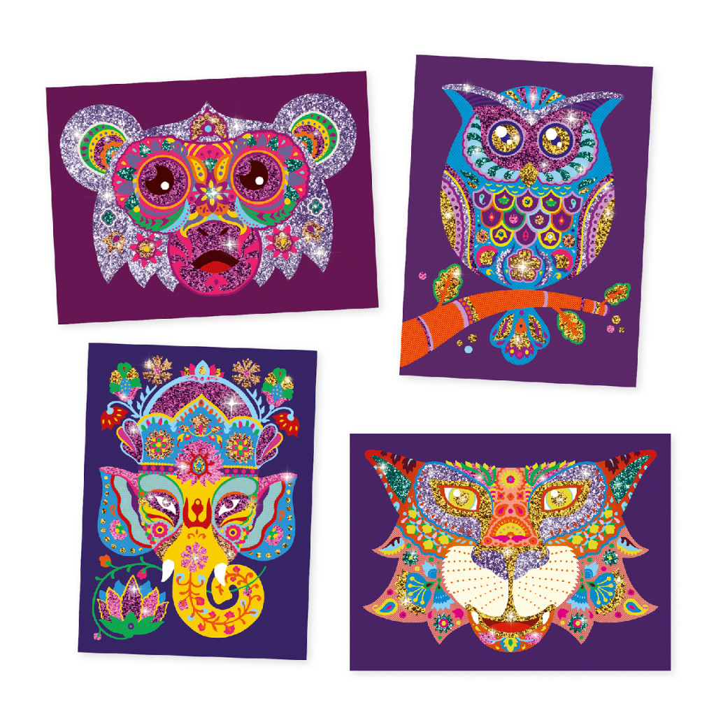 A fán ülő bagoly, vagy a cirkuszi hangulatot idéző elefánt igazi ragyogással telik meg, mihelyt ügyes kis kezek bevonják csillámporral. A feladat nagyon egyszerű és szórakoztató: az adott felületekről el kell távolítani az öntapadós matricát védő fóliát, majd be kell szórni a csillámporral, elegyengetni a színt, eltávolítani a felesleget az erre a célra kialakított dobozban, és máris kész a mű! Csodás dekoráció, ötletes ajándék!