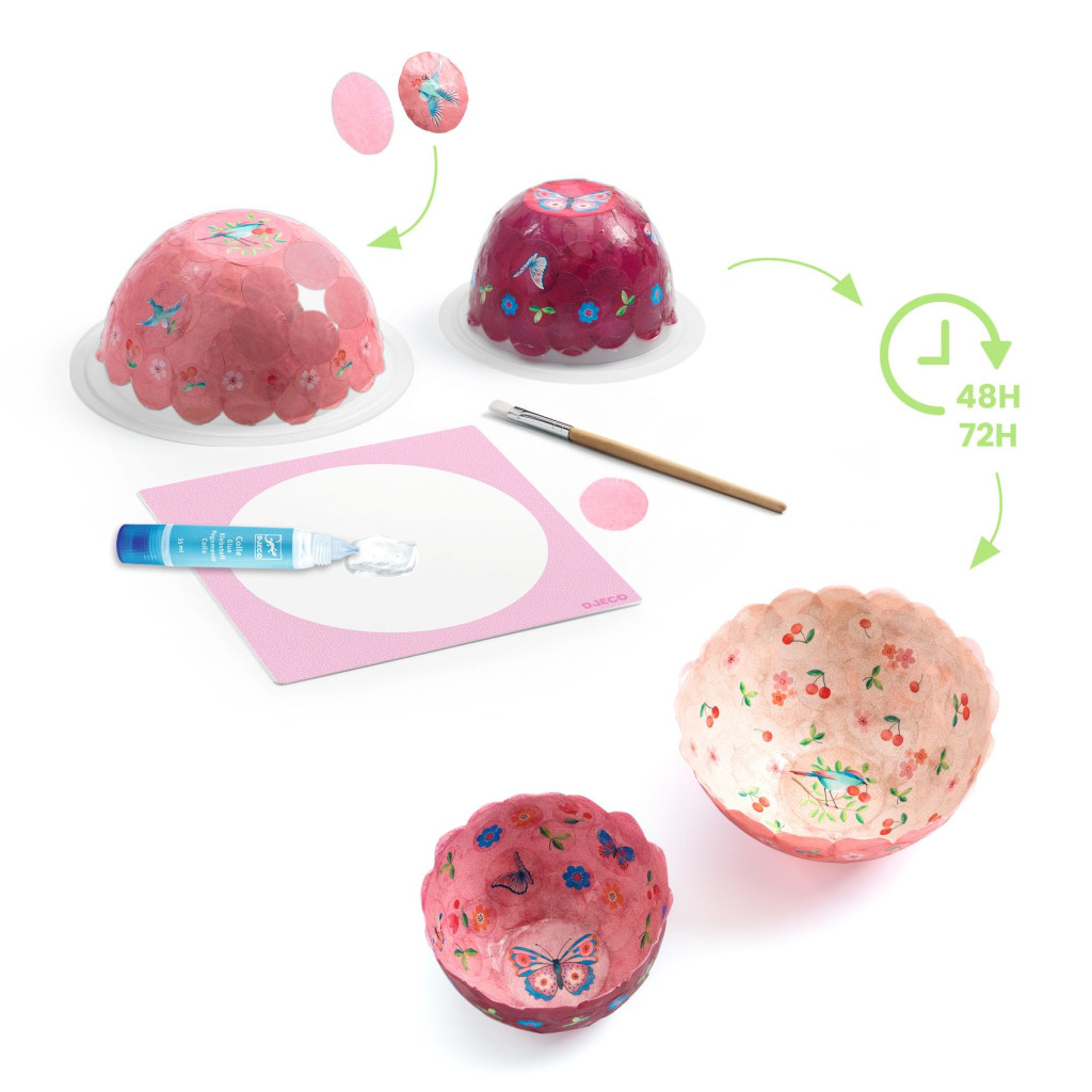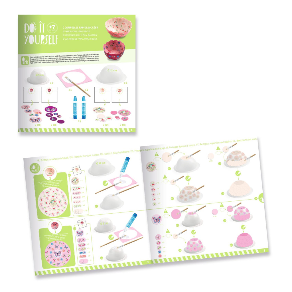 Teljes kreatív készlet két dekoratív papírtálka készítéséhez, csupán papír és ragasztó felhasználásával. A gyermek egyszerűen ragassza a kis korong darabokat a formákhoz a folyékony ragasztóval, először a tál belsejére, majd a külső oldalára, hagyja megszáradni, majd vegye ki a formából. A (képes) használati útmutató részletes segítséget ad a tálkák elkészítésében.