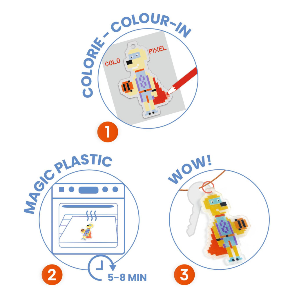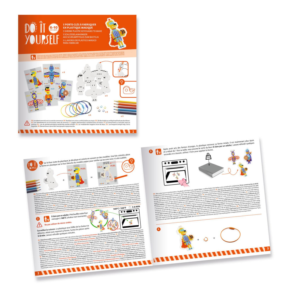 Ezzel a készlettel a gyerekek öt szuperhősös kulcstartót készíthetnek PIXEL-es stílusban! Ehhez a modellt a megfelelő átlátszó műanyag sziluett alá helyezik, és színes ceruzákkal reprodukálják. A sütőben megtörténik a varázslat: a darabok másodpercek alatt összezsugorodnak, a műanyag pedig merevvé és vastagabbá válik. Nincs más hátra, mint a színes karikára akasztani a pixeles hősöket, hogy "kulcsra készek" legyenek. Használható még táskára fityegőnek, cipzárra, medálnak és jó ajándékötlet lehet egy barátnak.