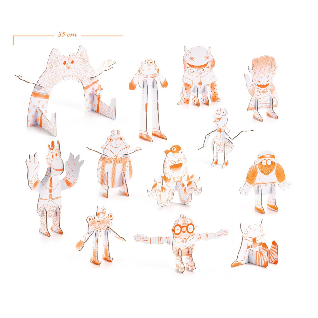 Kreatív készlet kartondarabok sokaságával, amelyeket kiszínezhet és összeállíthat a gyermek, hogy vicces és meglepő szörnyek egész csapatát elkészítse. A színezés minden kreatív öröme és az összeépítés több órára elegendő elfogaltságot ad. Ragasztó és olló nélkül szerelhetőek a vastag és ellenálló kartondarabok előre kivágott elemeinek köszönhetően.