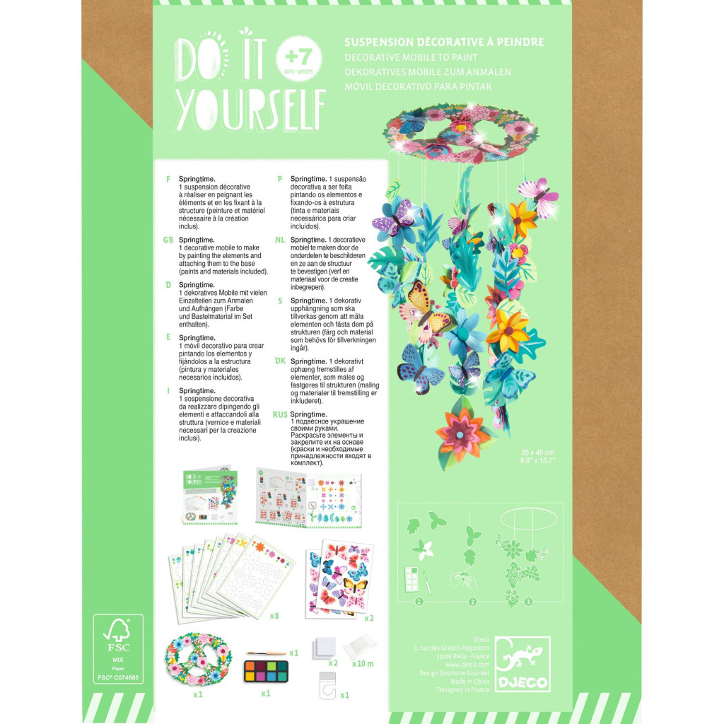 A gyermek a virágokat és a leveleket a készletben lévő 8 színű gouache festékkel kiszínezi. Miután megszáradtak a virágok és levélkék, felfűzi azokat, hogy szép színes füzéreket hozzon létre. Nem marad más hátra, mint a füzéreket az előre kifúrt alapra rögzíteni, és mindent a csodásan csillogó pillangókkal díszíteni. A metál tükröződésekkel készített fém alapanyagú pillangók ragyognak a fényben. Komplett és mégis egyszerű kreatív készlet: az összes anyagot tartalmazza ami a függődísz készítéshez kell. A gyermek fest, fűz, díszít, és gyönyörködik a munkája eredményében. A gyermek egy gyönyörű dekorációs tárgyat alkot, amely tavaszi hangulatot kölcsönöz a gyermekszobának!