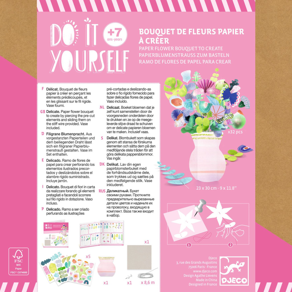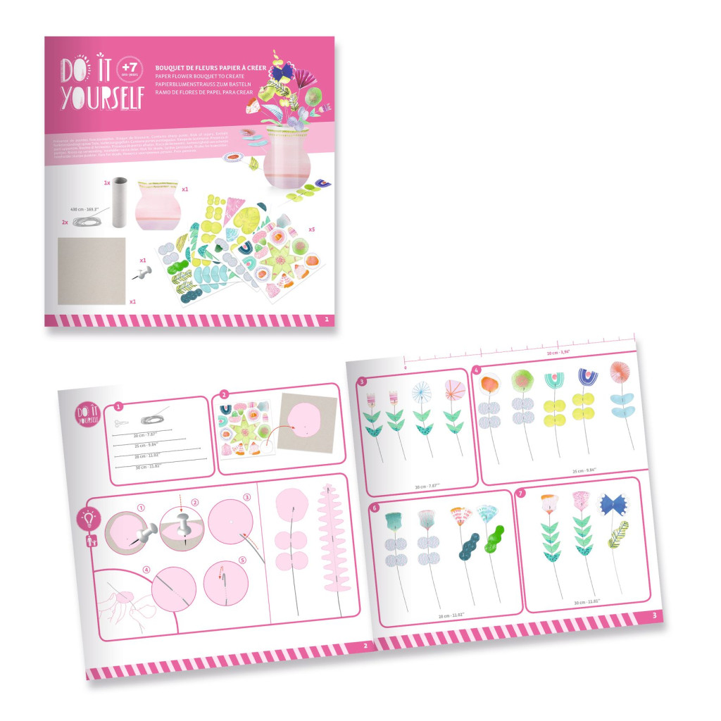 Mi lehet szebb, mint egy csokor virág, amely hervadás nélkül díszíti a gyerekszobát? Ez a kreatív készlet tartalmazza az összes anyagot, amellyel több mint 30 papírvirág és zöld leveles szár készíthető, valamint egy helyes kis váza is, amelyben a virágcsokor elrendezhető. A védőtálcán a gyermek a rajzszög segítségével átszúrja az előre kivágott elemeket, majd felcsúsztatja azokat a szárakra, hogy szép papírvirágokat és leveles szárakat hozzon létre, amelyeket csak a mellékelt vázába kell helyezni.