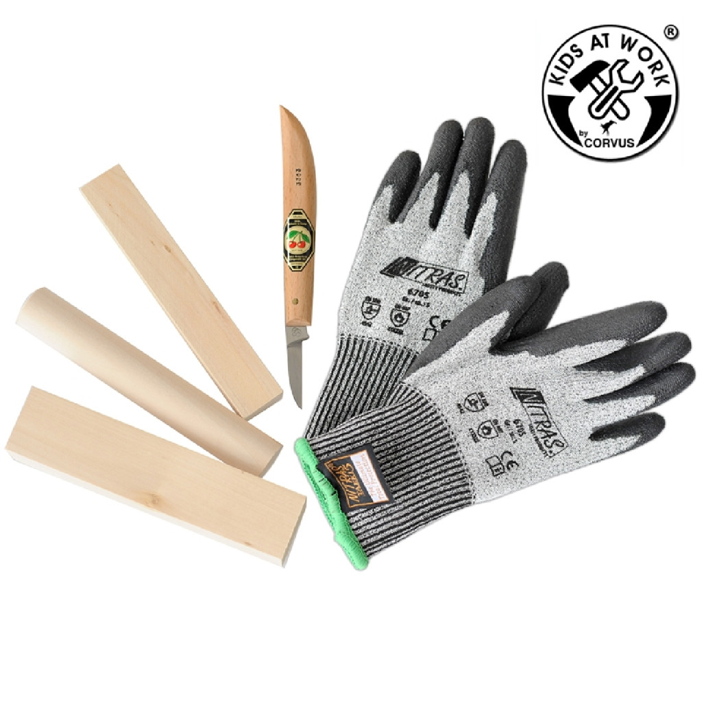Fafaragó készlet - Kirschen kés, vágásbiztos védő kesztyű, faanyag