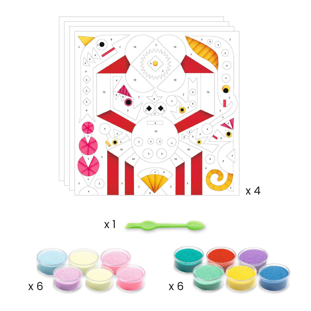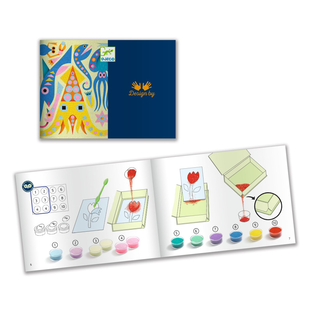 Djeco által készített, okos eszköz van a készletben a ragasztott részek egyszerű eltávolításához. Tiszta tevékenység: mert a gyermek a dobozban dolgozik, így nem szóródik szét a homok. Ez egy okos készlet, mert a dobozban van egy kis lyuk, ahol kiönthető a felesleges homok és széles szájú edényekbe önthető. Van jó tárolódoboz, rugalmas záródással az anyag tárolására, ha a tevékenység véget ért. A készletben egy magyarázó füzet is található, amely lépésről lépésre részletezi, hogyan lehet homokképet készíteni.