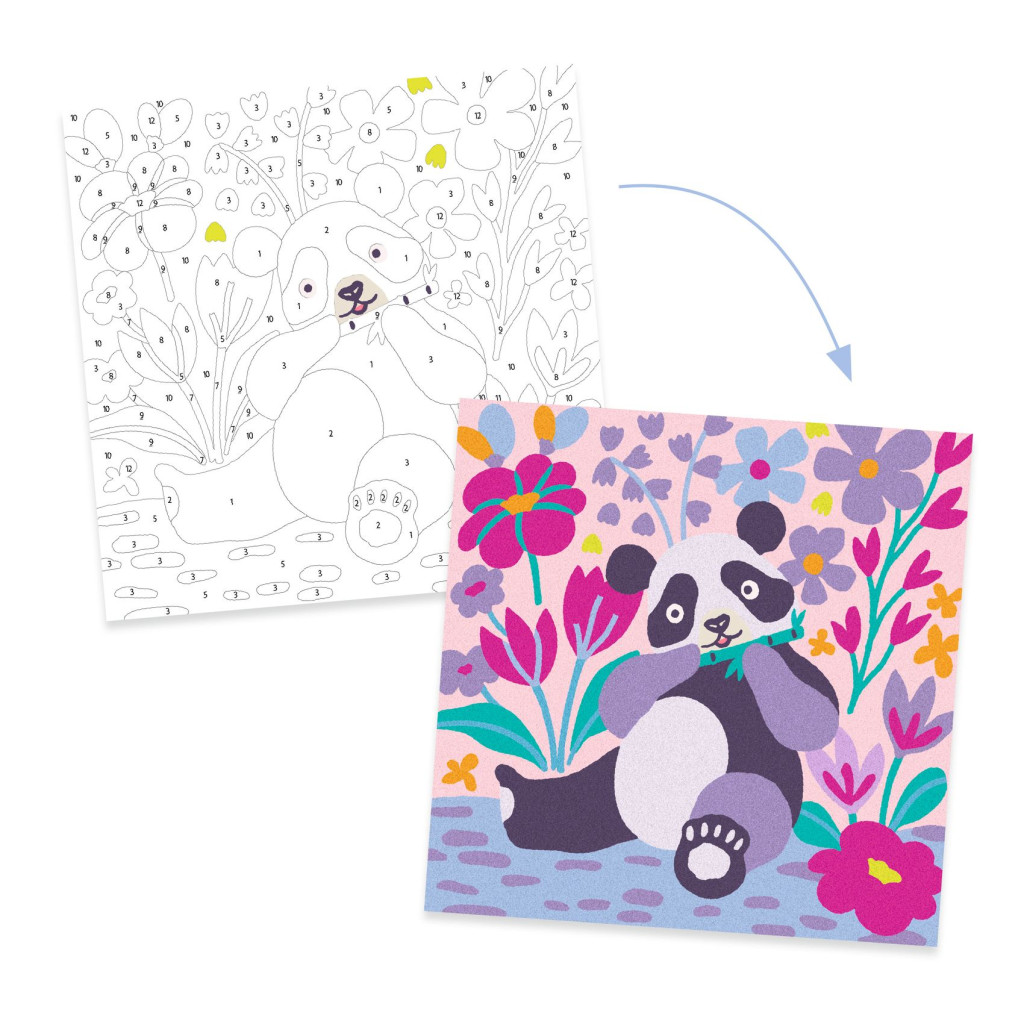 4 elbűvölő állatot (pandát, vörös pandát, gyűrűsfarkú makit és koalát) bemutató kép, amelyeket színezett homokkal kell "életre kelteni". A gyermek az alapképet a dobozba helyezi, a mellékelt eszközzel feltárja az előre beillesztett területeket, majd a füzetben megadott színkódot követve homokkal szórja be azokat. A készlet tartalmaz egy kis eszközt a ragasztott részek egyszerű eltávolításához. Tiszta tevékenység: a gyermek a dobozban dolgozik, így nem szóródik szét a homok. A doboz sarkán található egy kis lyuk, ahol kiönthető a felesleges homok és széles szájú edényekbe önthető. A készlethez tartozó kis magyarázó füzet lépésről lépésre vezet az alkotás folyamatán.