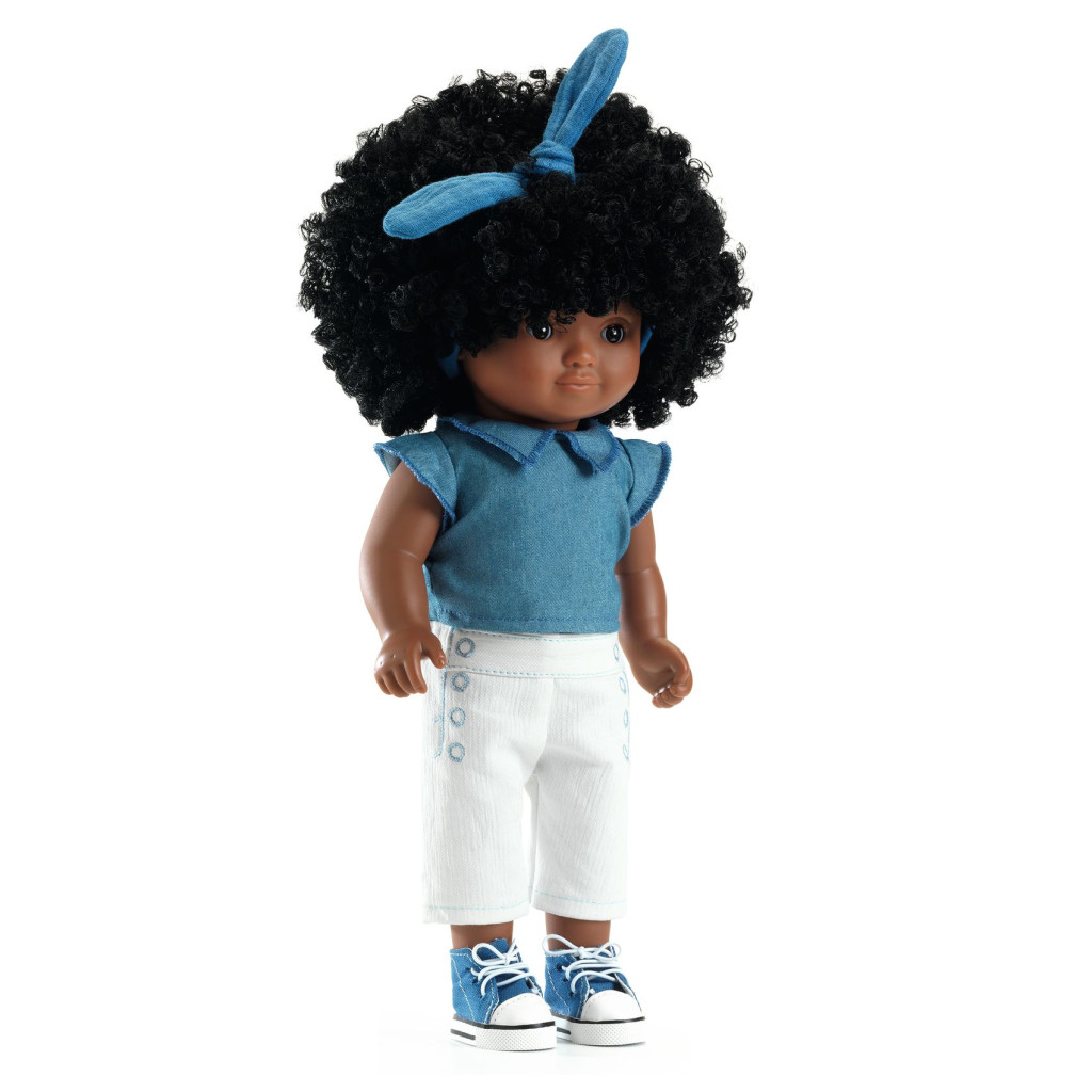 Zsani 32 cm magas, álló, bájos arcú, lány baba. Göndör, afro-textúrájú haja egyszerűen gyönyörű. Hátára fektetve szép, sötét szemei finoman lecsukódnak. Arca, teste, és végtagjai kellemes tapintású, puha vinilből készültek. Rock & Roll stílusú öltözékét alsónemű, kék rövid ujjú blúz, fehér vászon nadrág alkotja. Összeállításához illő fejpántja és tornacipője még inkább feldobja megjelenését. Zsani baba és az Ön gyermeke biztosan gyorsan összebarátkoznak!