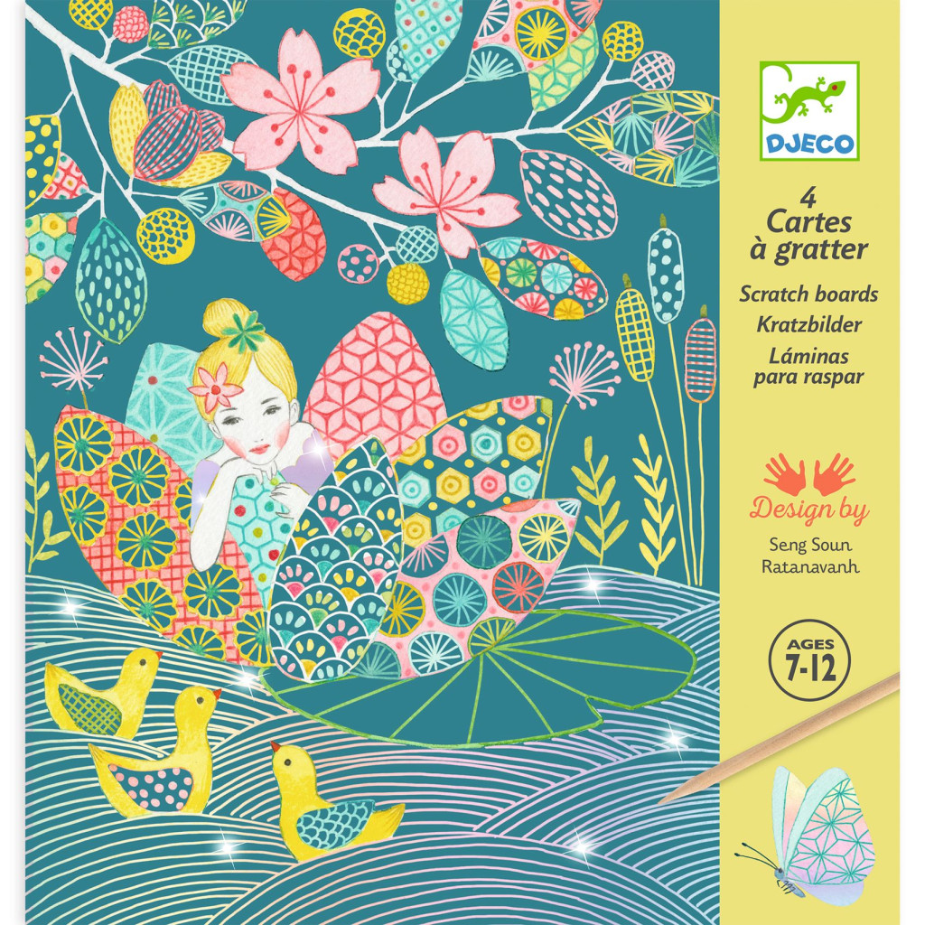 4 karcképből álló sorozat irizáló színjátszással, tükröződésekkel egy kellemes, meglepetésekkel teli sétát ábrázol a tó partján. A gyermek a művész által elképzelt mintákat reprodukálja úgy, hogy a felületet a fa karctollal megkarcolja és így fokozatosan, mintegy varázsütésre feltárulnak az illusztrációk!