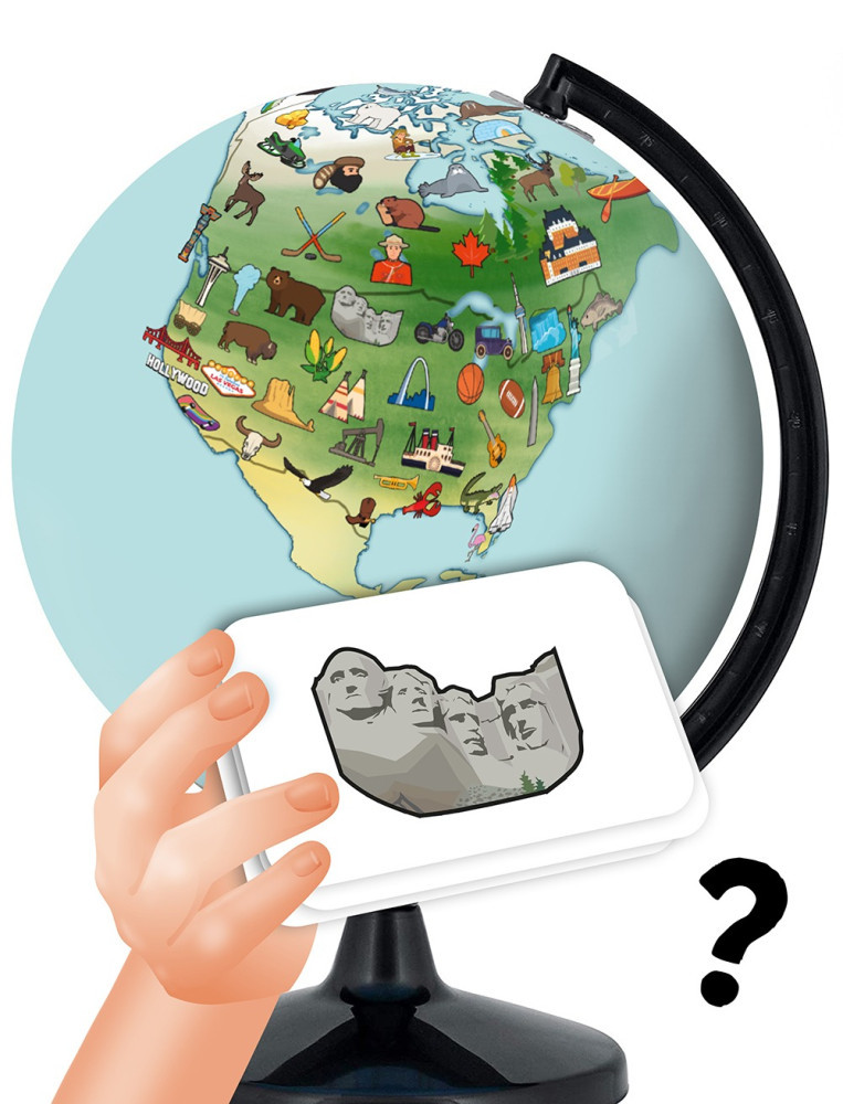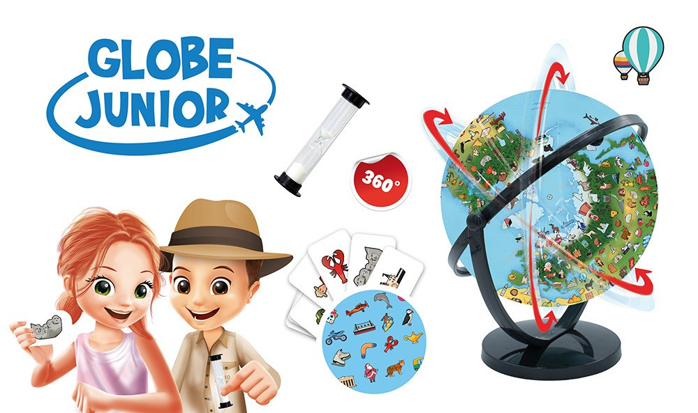 Minden irányba elforgatható, illusztrált 20 cm-es földgömb, amely megismerteti a gyerekekkel a világot. A térképen több mint 300 rajz található: állatok, műemlékek, sportok, ételek stb. A cél? Találd meg a földgömbön lévő rajzot a lehető leggyorsabban. A gyermek húz egyet a 300 kártya közül, megnézi a rajzot, megfordítja a homokórát, és megkeresi a földgömbön a rajzot, mielőtt a homokóra lejárna. Minden kártya hátoldalán egy anekdota vagy információ található angolul.