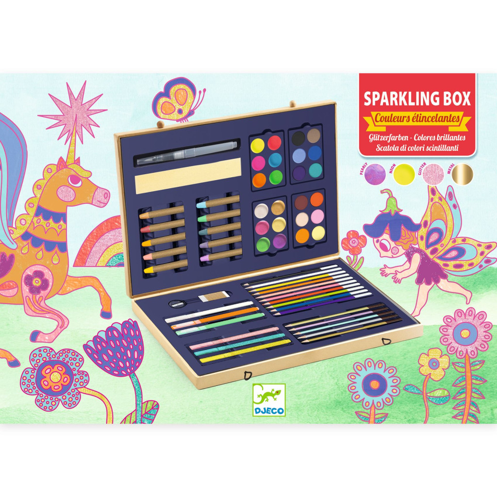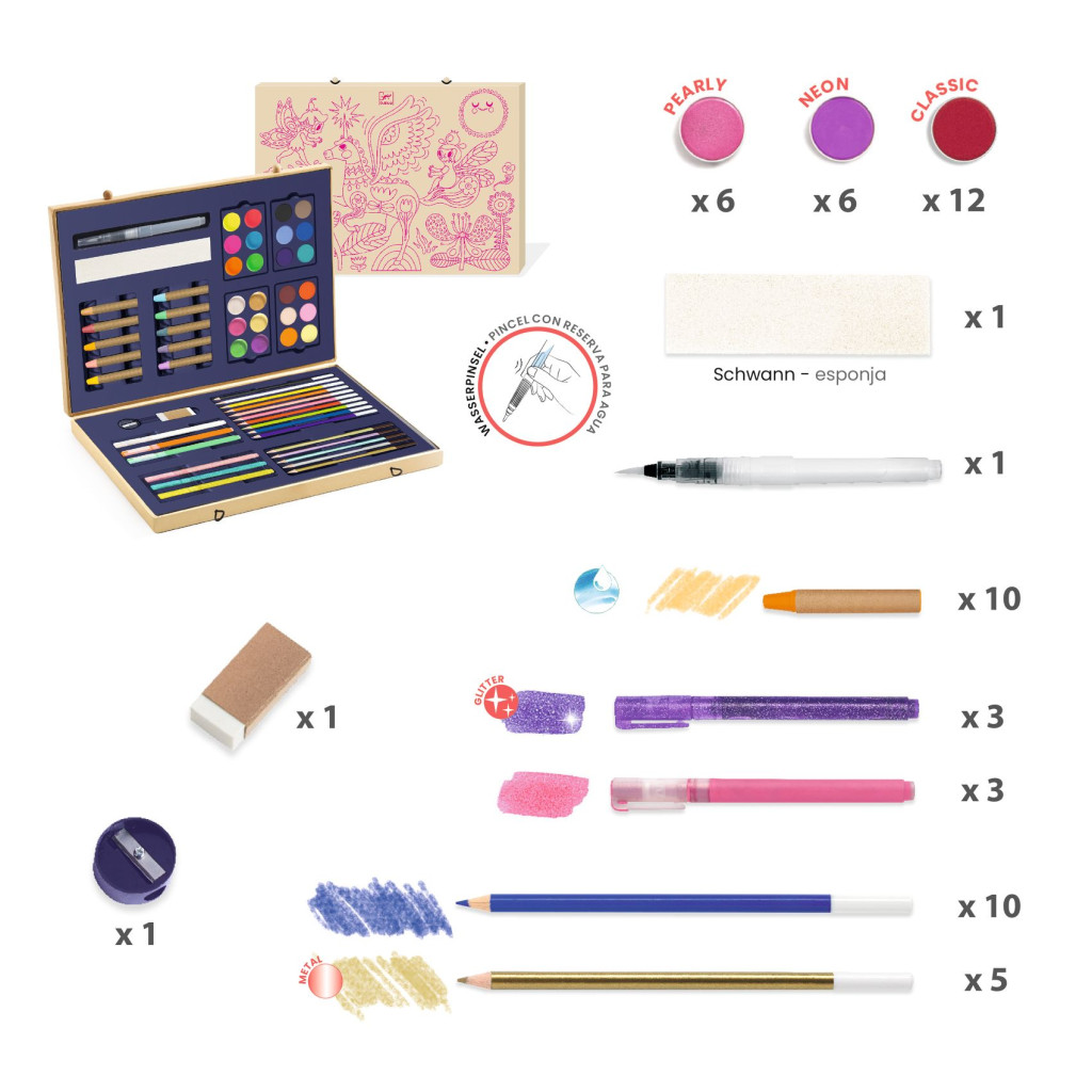 Ez a kreatív készlet minőségi felszerelést tartalmaz és lehetőséget kínál a kezdő művészeknek, hogy megismerjék a különböző festési és alkotási technikákat. A dobozban az egyik oldalt az akvarellnek és a festészetnek szentelték, a másikat a rajznak. A csillámos, neonos, gyöngyszínű vagy metálos színek lehetővé teszik a gyermek számára, hogy feldobja alkotásait. A doboz külsejét színezhető kép díszíti, hogy személyre szabható legyen a felszerelést tároló doboz kinézete is.
