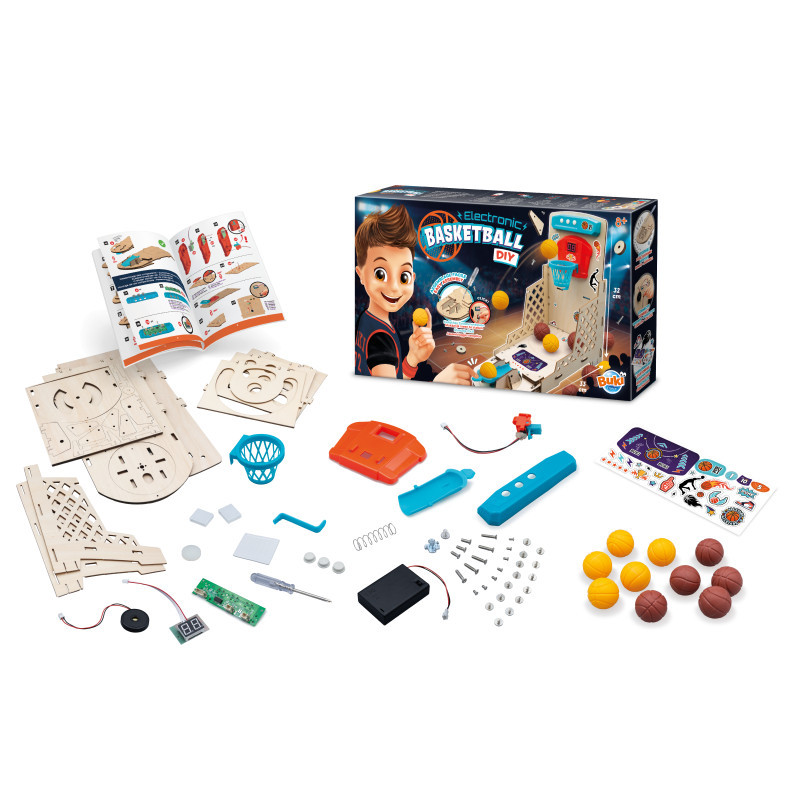 A mellékelt csavarhúzóval a gyerekek biztonságosan összeállíthatják a ponttáblát, a vezérlőpanelt, a hangszórót és az elemtartót – forrasztás nélkül. A mellékelt matricákkal személyre szabhatják a palánkot. Az elektronikus ponttábla minden kosár után hangjelzést ad, visszaszámolja az időt és nyomon követi a pontszámokat. A gyerekek egyedül is használhatják a játékot vagy versenyezhetnek egy barátjukkal, és összehasonlíthatják a pontszámokat.