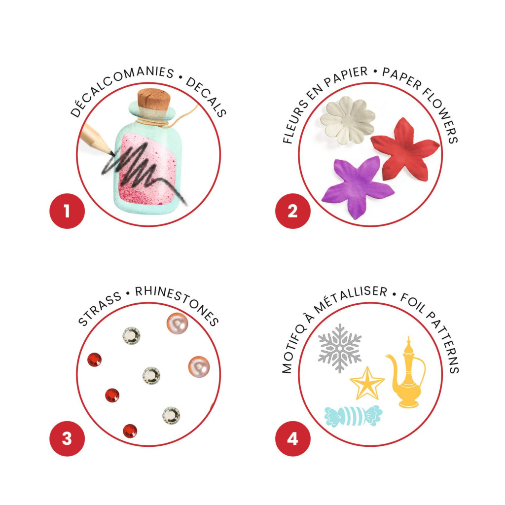 A készlet mind a 4 illusztrációja (4 jelenet a Diótörőből) négy különböző tevékenységet egyesít, lehetővé téve a gyermekek számára, hogy szórakozás közben fedezzenek fel különféle művészi technikákat. A tevékenységeket úgy tervezték, hogy könnyen végrehajthatóak legyenek a garantált siker érdekében. Minden kép matricákkal, papírvirágokkal, öntapadó strasszokkal és fóliával díszíthető. Ez a négyféle lehetőség együtt négyszer csodálatosabb eredményt ígér!