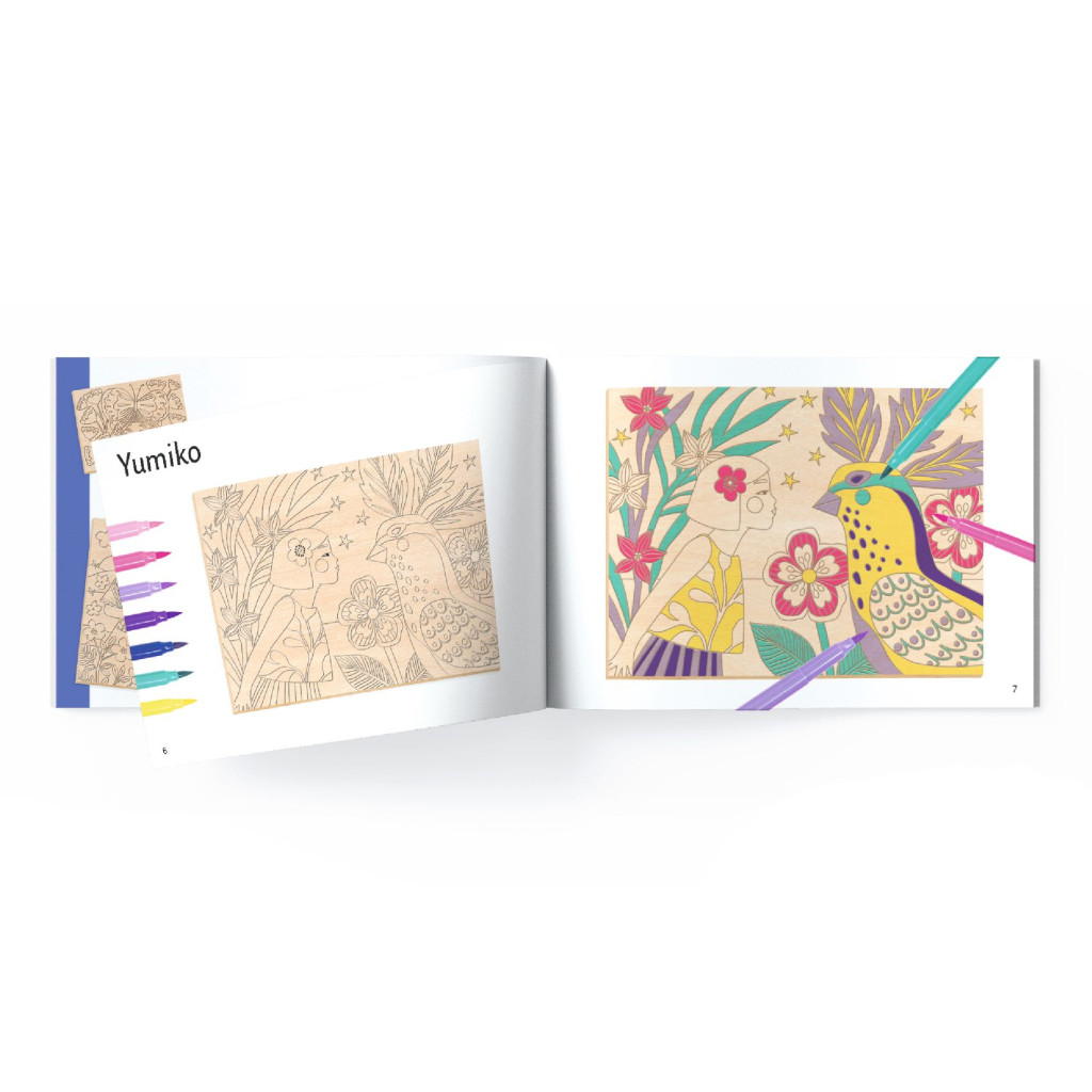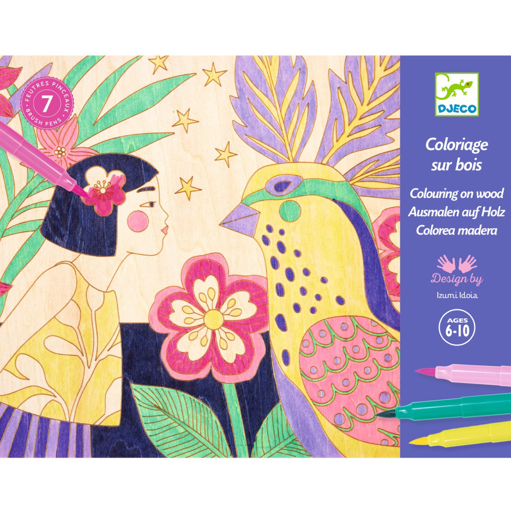 Eredeti színező tevékenység fa paneleken. A filctollakkal felfegyverkezve a gyerekek lépésről lépésre követik a művész utasításait a költői illusztrációk színezéséhez. Praktikus, mert a fába húzott barázdák vezetik a tintát és megakadályozzák a színek keveredését!
