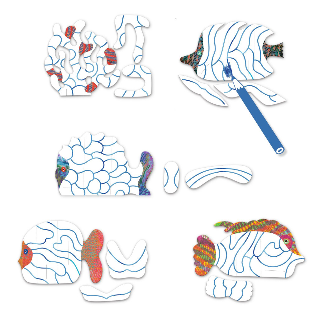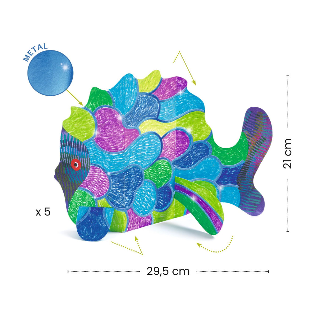 Kreatív színező készlet a dobozban, amelyből csodálatos tengeri világot hoz létre a gyermek! Először színezi, majd összehajtja és összeszereli a darabokat. Megjelenik egy tengeri világ, amely a fémes színezéken visszaverődő fényeknek köszönhetően szinte világít.