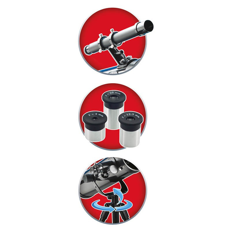 Fedezd fel a csillagos eget, a bolygókat a Hold krátereit! A teleszkóphoz tartozik egy 76 mm átmérőjű lencse és három cserélhető okulár (20, 12,5 és 4 mm).