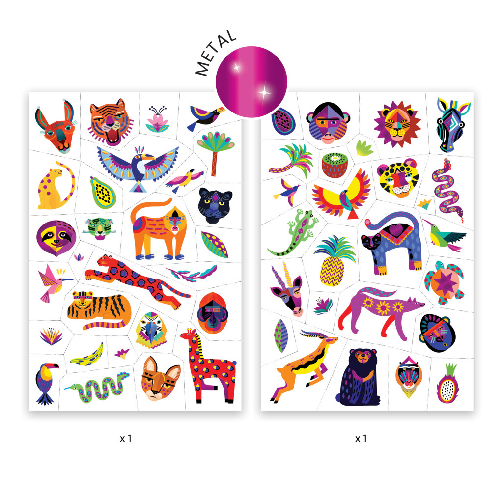 Két lapon ideiglenes tetováláshoz matricák a vadállatok témájában, az ábrázolt figurákat metál területek díszítik. Könnyen használható, előre perforált és kevés vízzel felvihető tetováló matricák.