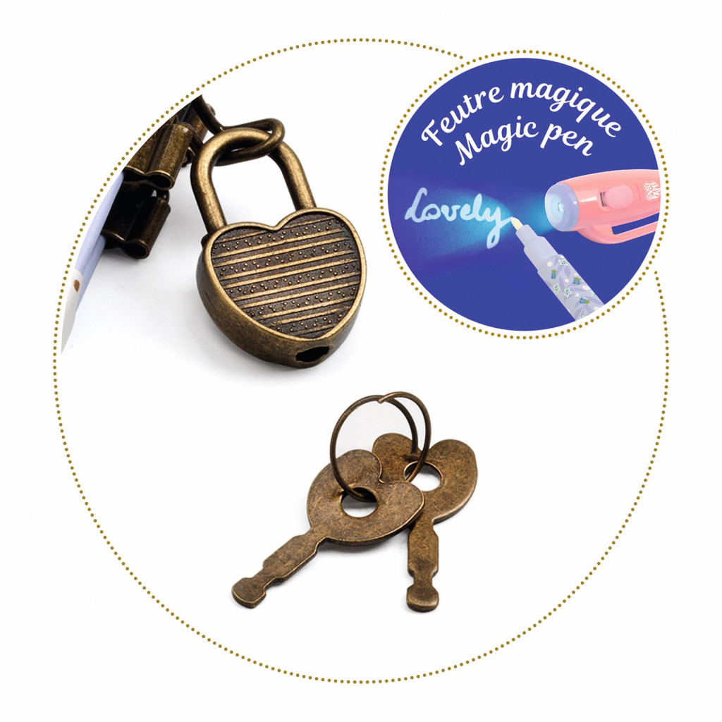 A jegyzetfüzet borítója mesésen gazdagon díszített, mégis könnyeden elegáns. Az élénk és a pasztellszínek arányai harmonikusan széppé varázsolják ezt a titkos naplót. A varázstoll valóban varázsolni tud, egyrészt ezzel lehet írni a láthatatlanná váló betűket, másrészt ennek a tollnak a lámpácskájának fényénél vállnak olvashatóvá a leírt szavak, mondatok, történetek, titkok és élmények. Egy lakathoz két kulcs van, vajon kinek adja oda a naplóíró a titkaihoz a második kulcsot?