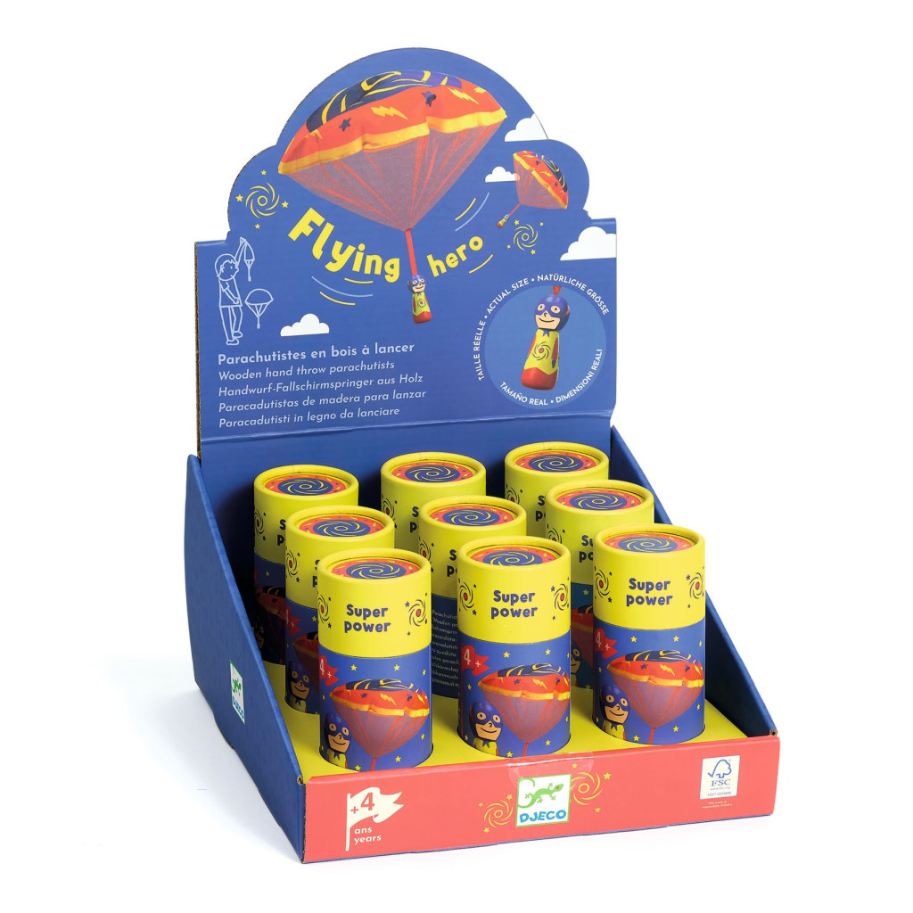 A Djeco új, "Szuper erő" ejtőernyős játéka egy kisméretű, fából készült figura ejtőernyővel, amelyet úgy kell dobnod, hogy a lehető leghosszabb ideig lebegjen a levegőben. A sorozat korábbi tagjai: Szuper Villám, Szuper Macska és Szuper Bagoly után "Szuper Erő" is praktikus és egyedi dobozban érkezik.