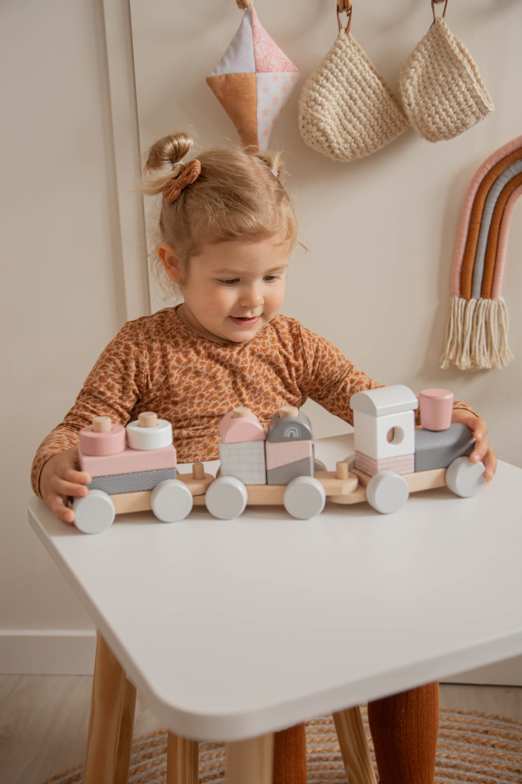 Ez a gyönyörű, modern pasztell rózsaszín és szürke színű vonat garantáltan elbűvöli a gyerekeket és a szoba dísze is lehet. A finom, sima felülete biztonságos és kényelmes a tapintásra.